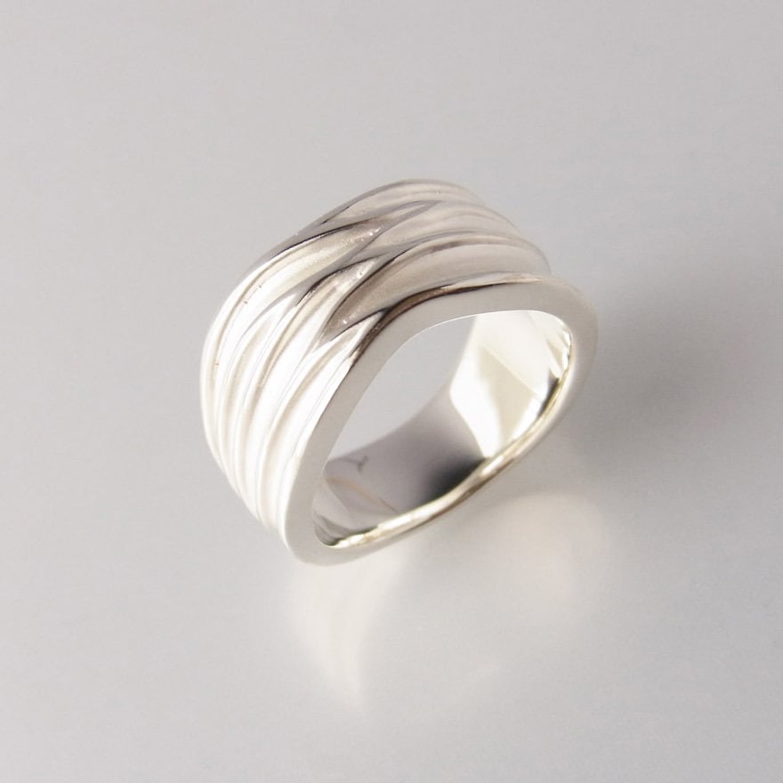 流れるラインが幾重にも重なったSilver925製のリング。凹部分はマット、凸部分は鏡面の二種の輝きのコントラストが幅広ながら繊細さも感じさせる印象です。